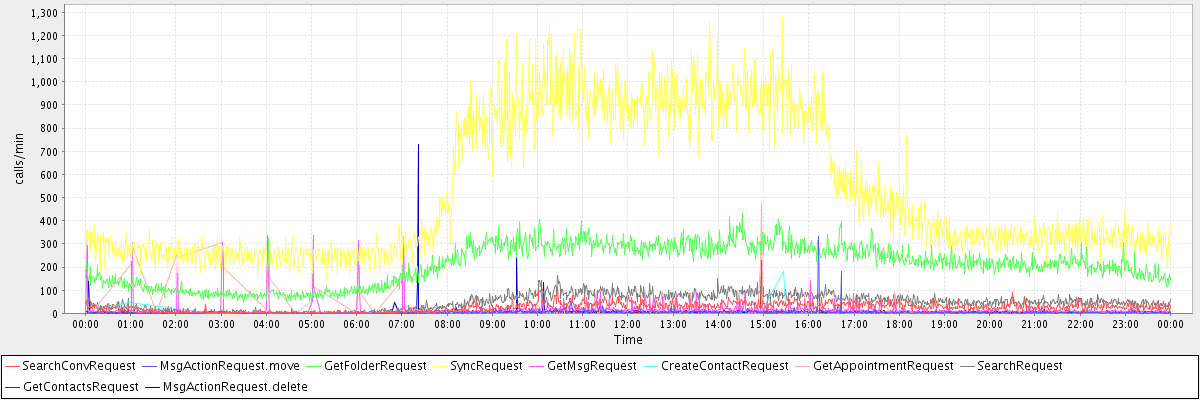 max(SearchConvRequest) = 112.00 max(MsgActionRequest.move) = 331.00 max(GetFolderRequest) = 432.00 max(SyncRequest) = 1272.00 max(GetMsgRequest) = 336.00 max(CreateContactRequest) = 181.00 max(GetAppointmentRequest) = 480.00 max(SearchRequest) = 187.00 max(GetContactsRequest) = 228.00 max(MsgActionRequest.delete) = 729.00