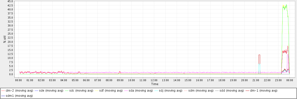 avg(dm-2) = 0.64 avg(sde) = 0.64 avg(sdc) = 0.99 avg(sdf) = 1.01 avg(sda) = 1.10 avg(sdj) = 0.08 avg(sdm) = 0.08 avg(sdd) = 0.00 avg(dm-1) = 0.12 avg(sdm1) = 0.00