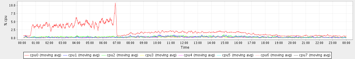 avg(cpu0) = 2.01 avg(cpu1) = 0.25 avg(cpu2) = 0.32 avg(cpu3) = 0.19 avg(cpu4) = 0.14 avg(cpu5) = 0.16 avg(cpu6) = 0.23 avg(cpu7) = 0.16