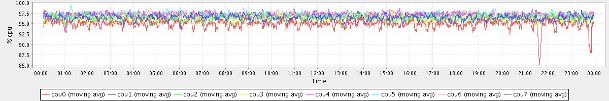 avg(cpu0) = 94.97 avg(cpu1) = 96.47 avg(cpu2) = 96.34 avg(cpu3) = 96.25 avg(cpu4) = 96.98 avg(cpu5) = 97.00 avg(cpu6) = 97.13 avg(cpu7) = 97.00