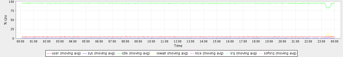 avg(user) = 3.96 avg(sys) = 0.34 avg(idle) = 95.40 avg(iowait) = 0.28 avg(nice) = 0.00 avg(irq) = 0.00 avg(softirq) = 0.00