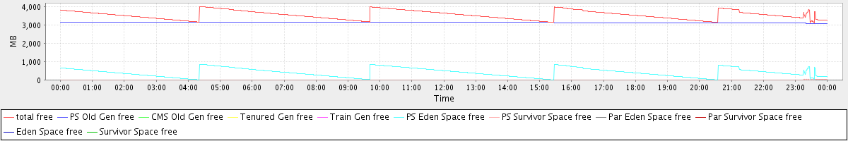 avg(total free) = 3536.77 avg(PS Old Gen free) = 3130.67 avg(CMS Old Gen free) = 0.00 avg(Tenured Gen free) = 0.00 avg(Train Gen free) = 0.00 avg(PS Eden Space free) = 403.03 avg(PS Survivor Space free) = 3.06 avg(Par Eden Space free) = 0.00 avg(Par Survivor Space free) = 0.00 avg(Eden Space free) = 0.00 avg(Survivor Space free) = 0.00