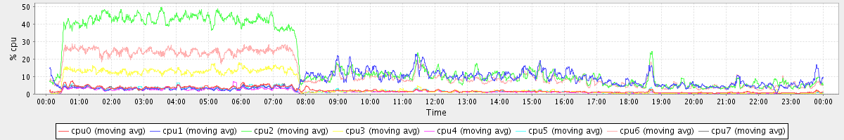 avg(cpu0) = 2.30 avg(cpu1) = 0.38 avg(cpu2) = 0.42 avg(cpu3) = 0.31 avg(cpu4) = 0.21 avg(cpu5) = 0.28 avg(cpu6) = 0.33 avg(cpu7) = 0.28