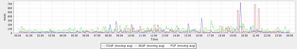 max(AddMsgRequest) = 149.00 max(NoOpRequest) = 291.00 max(GetFolderRequest) = 124.00 max(SyncRequest) = 3218.00 max(GetMsgRequest) = 121.00 max(GetAppointmentRequest) = 121.00 max(SearchRequest) = 646.00 max(MsgActionRequest.delete) = 831.00 max(ItemActionRequest.delete) = 170.00 max(SendMsgRequest) = 150.00