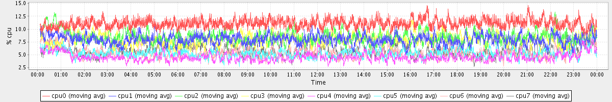 avg(cpu0) = 11.04 avg(cpu1) = 7.96 avg(cpu2) = 8.44 avg(cpu3) = 7.95 avg(cpu4) = 4.54 avg(cpu5) = 5.32 avg(cpu6) = 5.46 avg(cpu7) = 5.76