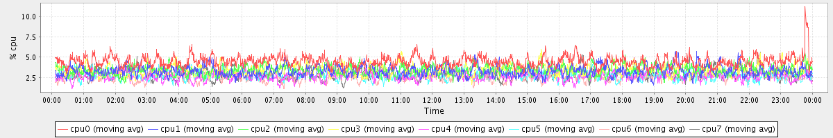 avg(cpu0) = 4.47 avg(cpu1) = 3.28 avg(cpu2) = 3.43 avg(cpu3) = 3.42 avg(cpu4) = 2.72 avg(cpu5) = 2.87 avg(cpu6) = 2.71 avg(cpu7) = 2.92