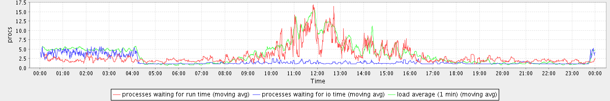 avg(processes waiting for run time) = 2.46 avg(processes waiting for io time) = 0.99 avg(load average (1 min)) = 3.69