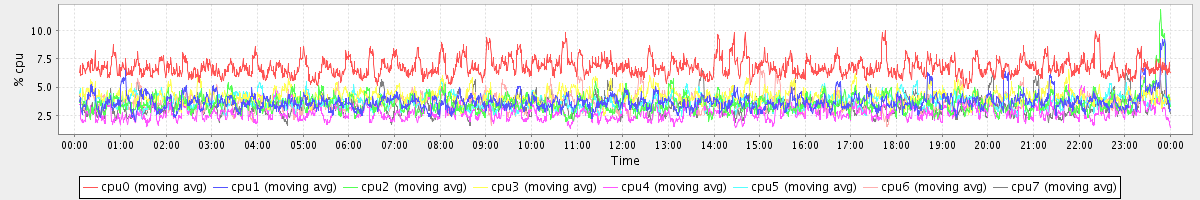 avg(cpu0) = 6.74 avg(cpu1) = 3.70 avg(cpu2) = 3.59 avg(cpu3) = 4.18 avg(cpu4) = 2.75 avg(cpu5) = 3.70 avg(cpu6) = 3.66 avg(cpu7) = 3.39