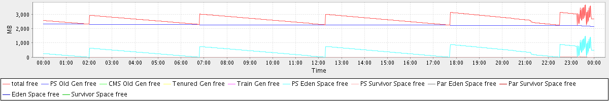 avg(total free) = 2651.64 avg(PS Old Gen free) = 2257.27 avg(CMS Old Gen free) = 0.00 avg(Tenured Gen free) = 0.00 avg(Train Gen free) = 0.00 avg(PS Eden Space free) = 391.48 avg(PS Survivor Space free) = 2.89 avg(Par Eden Space free) = 0.00 avg(Par Survivor Space free) = 0.00 avg(Eden Space free) = 0.00 avg(Survivor Space free) = 0.00