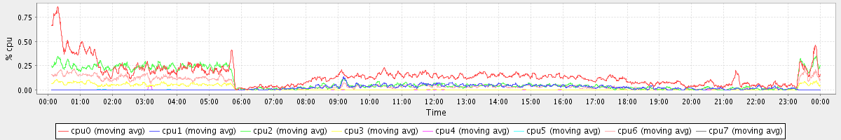 avg(cpu0) = 0.15 avg(cpu1) = 0.02 avg(cpu2) = 0.09 avg(cpu3) = 0.02 avg(cpu4) = 0.00 avg(cpu5) = 0.00 avg(cpu6) = 0.05 avg(cpu7) = 0.00
