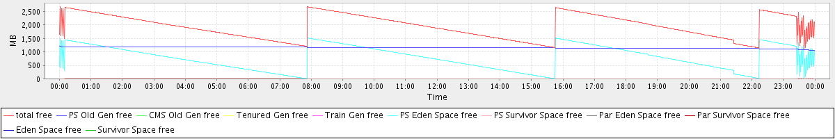 avg(total free) = 1951.33 avg(PS Old Gen free) = 1157.86 avg(CMS Old Gen free) = 0.00 avg(Tenured Gen free) = 0.00 avg(Train Gen free) = 0.00 avg(PS Eden Space free) = 788.89 avg(PS Survivor Space free) = 4.58 avg(Par Eden Space free) = 0.00 avg(Par Survivor Space free) = 0.00 avg(Eden Space free) = 0.00 avg(Survivor Space free) = 0.00