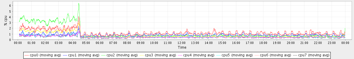 avg(cpu0) = 1.12 avg(cpu1) = 0.12 avg(cpu2) = 0.15 avg(cpu3) = 0.09 avg(cpu4) = 0.06 avg(cpu5) = 0.08 avg(cpu6) = 0.10 avg(cpu7) = 0.07