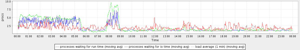 avg(processes waiting for run time) = 0.96 avg(processes waiting for io time) = 1.09 avg(load average (1 min)) = 2.35