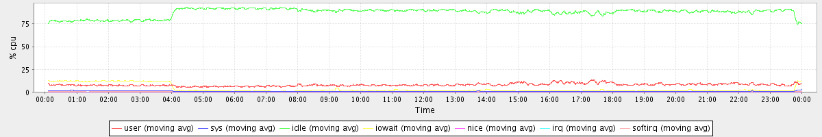 avg(user) = 7.92 avg(sys) = 0.79 avg(idle) = 87.69 avg(iowait) = 3.37 avg(nice) = 0.00 avg(irq) = 0.02 avg(softirq) = 0.21