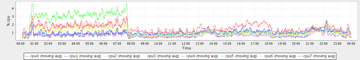 avg(cpu0) = 1.54 avg(cpu1) = 0.16 avg(cpu2) = 0.23 avg(cpu3) = 0.14 avg(cpu4) = 0.10 avg(cpu5) = 0.11 avg(cpu6) = 0.16 avg(cpu7) = 0.11