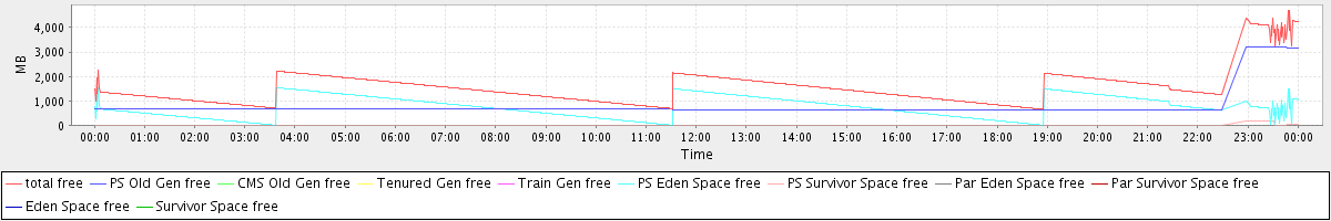 avg(total free) = 1527.72 avg(PS Old Gen free) = 777.68 avg(CMS Old Gen free) = 0.00 avg(Tenured Gen free) = 0.00 avg(Train Gen free) = 0.00 avg(PS Eden Space free) = 744.11 avg(PS Survivor Space free) = 5.93 avg(Par Eden Space free) = 0.00 avg(Par Survivor Space free) = 0.00 avg(Eden Space free) = 0.00 avg(Survivor Space free) = 0.00