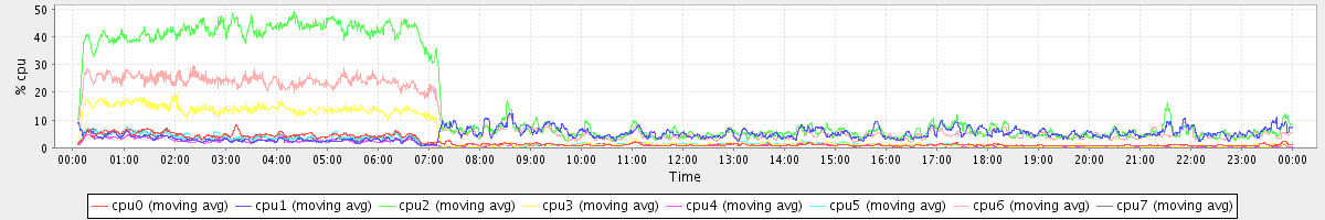 avg(cpu0) = 37.37 avg(cpu1) = 25.58 avg(cpu2) = 26.62 avg(cpu3) = 26.20 avg(cpu4) = 25.14 avg(cpu5) = 27.36 avg(cpu6) = 27.75 avg(cpu7) = 27.26