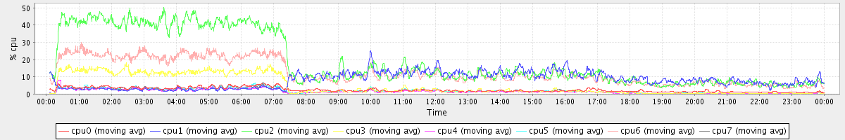 avg(cpu0) = 2.39 avg(cpu1) = 0.39 avg(cpu2) = 0.41 avg(cpu3) = 0.31 avg(cpu4) = 0.19 avg(cpu5) = 0.27 avg(cpu6) = 0.34 avg(cpu7) = 0.27