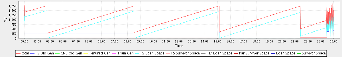 avg(total) = 1044.37 avg(PS Old Gen) = 288.75 avg(CMS Old Gen) = 0.00 avg(Tenured Gen) = 0.00 avg(Train Gen) = 0.00 avg(PS Eden Space) = 733.04 avg(PS Survivor Space) = 22.57 avg(Par Eden Space) = 0.00 avg(Par Survivor Space) = 0.00 avg(Eden Space) = 0.00 avg(Survivor Space) = 0.00