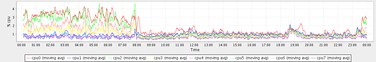avg(cpu0) = 1.58 avg(cpu1) = 0.15 avg(cpu2) = 0.27 avg(cpu3) = 0.15 avg(cpu4) = 0.11 avg(cpu5) = 0.11 avg(cpu6) = 0.18 avg(cpu7) = 0.10
