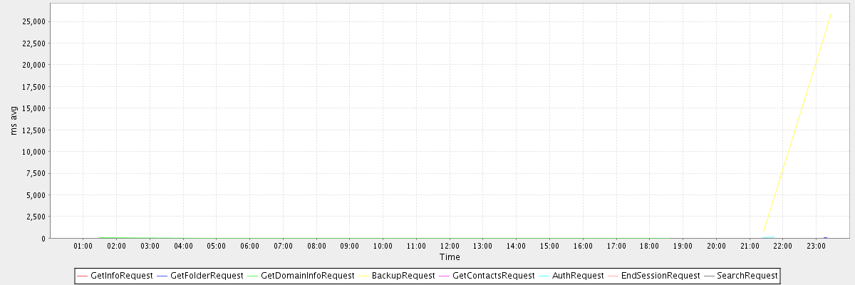 avg(GetInfoRequest) = 1141.00 avg(GetFolderRequest) = 70.00 avg(GetDomainInfoRequest) = 2.00 avg(BackupRequest) = 13285.00 avg(GetContactsRequest) = 3.00 avg(AuthRequest) = 69.33 avg(EndSessionRequest) = 1.00 avg(SearchRequest) = 64.00