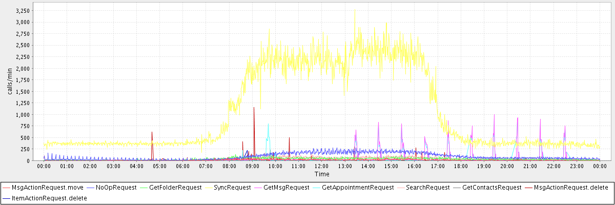max(MsgActionRequest.move) = 171.00 max(NoOpRequest) = 279.00 max(GetFolderRequest) = 127.00 max(SyncRequest) = 3270.00 max(GetMsgRequest) = 993.00 max(GetAppointmentRequest) = 913.00 max(SearchRequest) = 166.00 max(GetContactsRequest) = 235.00 max(MsgActionRequest.delete) = 1149.00 max(ItemActionRequest.delete) = 216.00