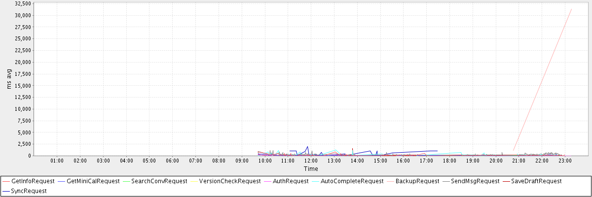 avg(GetInfoRequest) = 136.65 avg(GetMiniCalRequest) = 71.47 avg(SearchConvRequest) = 61.99 avg(VersionCheckRequest) = 694.00 avg(AuthRequest) = 51.00 avg(AutoCompleteRequest) = 142.41 avg(BackupRequest) = 16239.50 avg(SendMsgRequest) = 272.77 avg(SaveDraftRequest) = 62.23 avg(SyncRequest) = 519.72