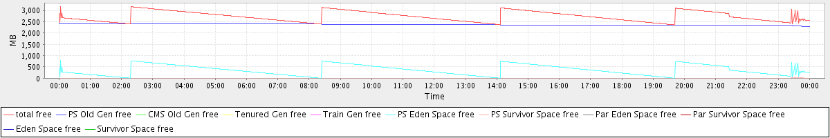 avg(total free) = 2733.38 avg(PS Old Gen free) = 2371.20 avg(CMS Old Gen free) = 0.00 avg(Tenured Gen free) = 0.00 avg(Train Gen free) = 0.00 avg(PS Eden Space free) = 360.51 avg(PS Survivor Space free) = 1.67 avg(Par Eden Space free) = 0.00 avg(Par Survivor Space free) = 0.00 avg(Eden Space free) = 0.00 avg(Survivor Space free) = 0.00