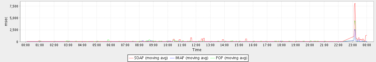 avg(SyncGalRequest) = 3793.78 avg(GetFreeBusyRequest) = 608.88 avg(SearchGalRequest) = 1245.37 avg(SearchDirectoryRequest) = 1605.00 avg(SetAppointmentRequest) = 447.86 avg(BackupRequest) = 701.00 avg(FolderActionRequest.empty) = 2091.41 avg(GetQuotaUsageRequest) = 3363.00 avg(ContactActionRequest.delete) = 827.67 avg(ConvActionRequest.delete) = 612.77