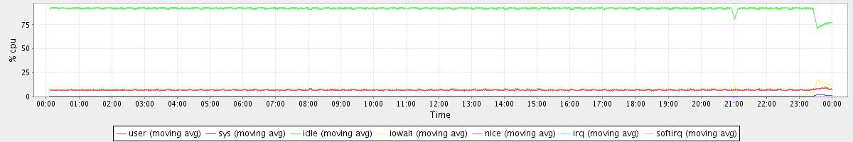 avg(user) = 7.08 avg(sys) = 0.72 avg(idle) = 91.70 avg(iowait) = 0.50 avg(nice) = 0.00 avg(irq) = 0.00 avg(softirq) = 0.01