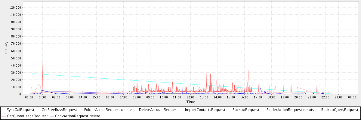 avg(SyncGalRequest) = 3505.23 avg(GetFreeBusyRequest) = 459.33 avg(FolderActionRequest.delete) = 999.83 avg(DeleteAccountRequest) = 122593.00 avg(ImportContactsRequest) = 3276.00 avg(BackupRequest) = 14532.00 avg(FolderActionRequest.empty) = 3529.77 avg(BackupQueryRequest) = 2239.75 avg(GetQuotaUsageRequest) = 3540.00 avg(ConvActionRequest.delete) = 653.85