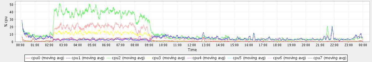 avg(cpu0) = 1.75 avg(cpu1) = 0.23 avg(cpu2) = 0.30 avg(cpu3) = 0.22 avg(cpu4) = 0.16 avg(cpu5) = 0.18 avg(cpu6) = 0.23 avg(cpu7) = 0.17