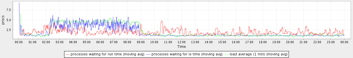 avg(processes waiting for run time) = 0.88 avg(processes waiting for io time) = 0.93 avg(load average (1 min)) = 2.10