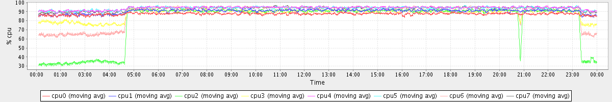 avg(cpu0) = 87.49 avg(cpu1) = 90.46 avg(cpu2) = 79.86 avg(cpu3) = 87.96 avg(cpu4) = 94.06 avg(cpu5) = 93.78 avg(cpu6) = 88.70 avg(cpu7) = 93.24