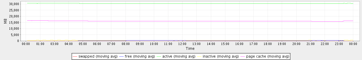 avg(swapped) = 0.25 avg(free) = 285.75 avg(active) = 30530.88 avg(inactive) = 534.60 avg(page cache) = 16155.88