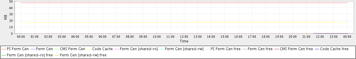 avg(PS Perm Gen) = 47.73 avg(Perm Gen) = 0.00 avg(CMS Perm Gen) = 0.00 avg(Code Cache) = 17.13 avg(Perm Gen [shared-ro]) = 0.00 avg(Perm Gen [shared-rw]) = 0.00 avg(PS Perm Gen free) = 0.04 avg(Perm Gen free) = 0.00 avg(CMS Perm Gen free) = 0.00 avg(Code Cache free) = 0.05 avg(Perm Gen [shared-ro] free) = 0.00 avg(Perm Gen [shared-rw] free) = 0.00