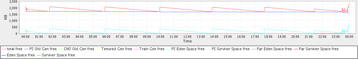 avg(total free) = 1870.36 avg(PS Old Gen free) = 1691.28 avg(CMS Old Gen free) = 0.00 avg(Tenured Gen free) = 0.00 avg(Train Gen free) = 0.00 avg(PS Eden Space free) = 176.37 avg(PS Survivor Space free) = 2.71 avg(Par Eden Space free) = 0.00 avg(Par Survivor Space free) = 0.00 avg(Eden Space free) = 0.00 avg(Survivor Space free) = 0.00