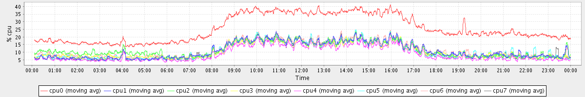 avg(cpu0) = 25.39 avg(cpu1) = 11.03 avg(cpu2) = 11.71 avg(cpu3) = 10.81 avg(cpu4) = 8.93 avg(cpu5) = 10.91 avg(cpu6) = 11.73 avg(cpu7) = 10.56
