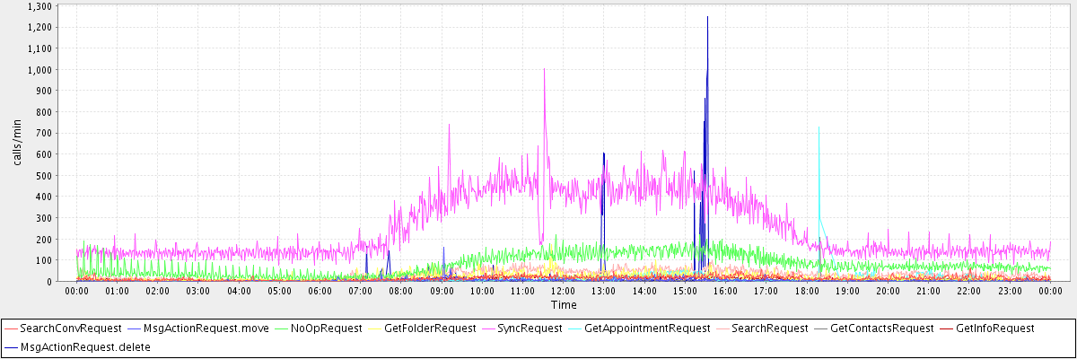 max(SearchConvRequest) = 61.00 max(MsgActionRequest.move) = 160.00 max(NoOpRequest) = 221.00 max(GetFolderRequest) = 171.00 max(SyncRequest) = 1003.00 max(GetAppointmentRequest) = 726.00 max(SearchRequest) = 151.00 max(GetContactsRequest) = 209.00 max(GetInfoRequest) = 44.00 max(MsgActionRequest.delete) = 1248.00
