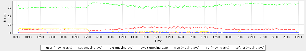 avg(user) = 11.48 avg(sys) = 1.04 avg(idle) = 82.04 avg(iowait) = 5.08 avg(nice) = 0.00 avg(irq) = 0.03 avg(softirq) = 0.33