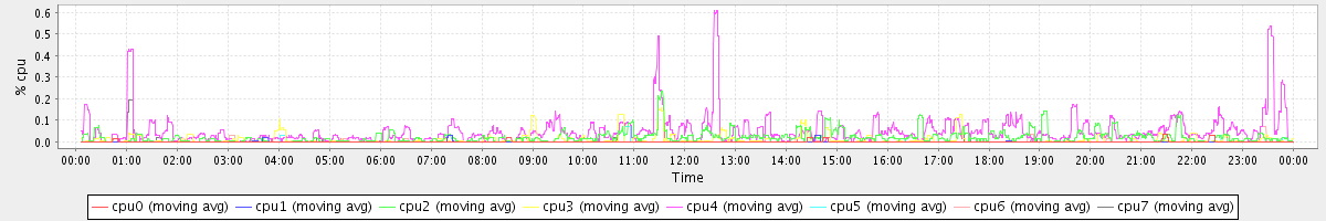 avg(cpu0) = 0.39 avg(cpu1) = 0.26 avg(cpu2) = 0.21 avg(cpu3) = 0.25 avg(cpu4) = 0.16 avg(cpu5) = 0.13 avg(cpu6) = 0.12 avg(cpu7) = 0.11