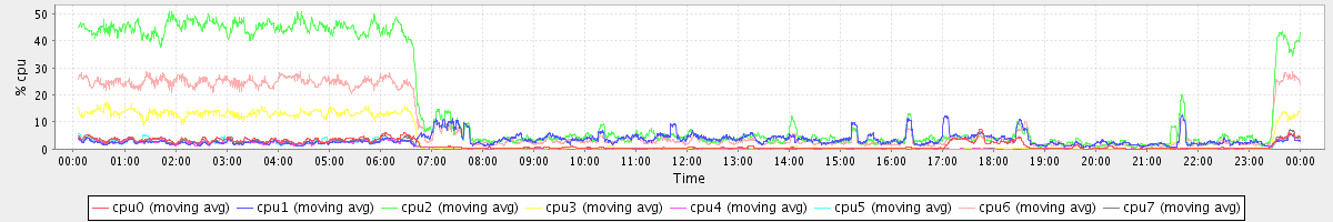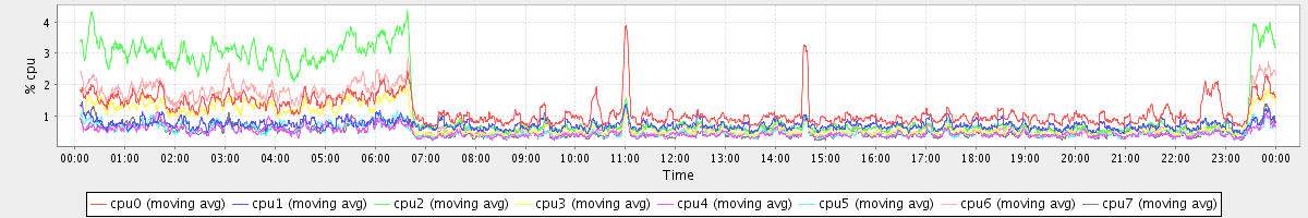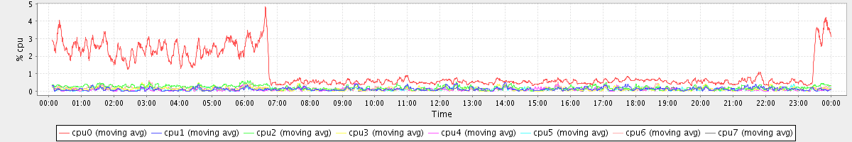 avg(cpu0) = 1.14 avg(cpu1) = 0.12 avg(cpu2) = 0.21 avg(cpu3) = 0.12 avg(cpu4) = 0.09 avg(cpu5) = 0.09 avg(cpu6) = 0.14 avg(cpu7) = 0.09