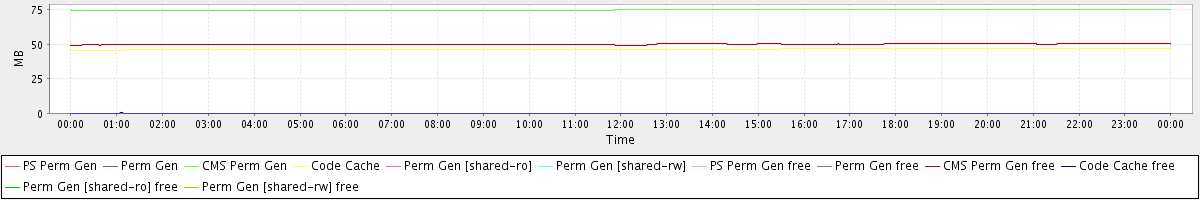 avg(PS Perm Gen) = 0.00 avg(Perm Gen) = 0.00 avg(CMS Perm Gen) = 74.78 avg(Code Cache) = 46.38 avg(Perm Gen [shared-ro]) = 0.00 avg(Perm Gen [shared-rw]) = 0.00 avg(PS Perm Gen free) = 0.00 avg(Perm Gen free) = 0.00 avg(CMS Perm Gen free) = 49.98 avg(Code Cache free) = 0.09 avg(Perm Gen [shared-ro] free) = 0.00 avg(Perm Gen [shared-rw] free) = 0.00