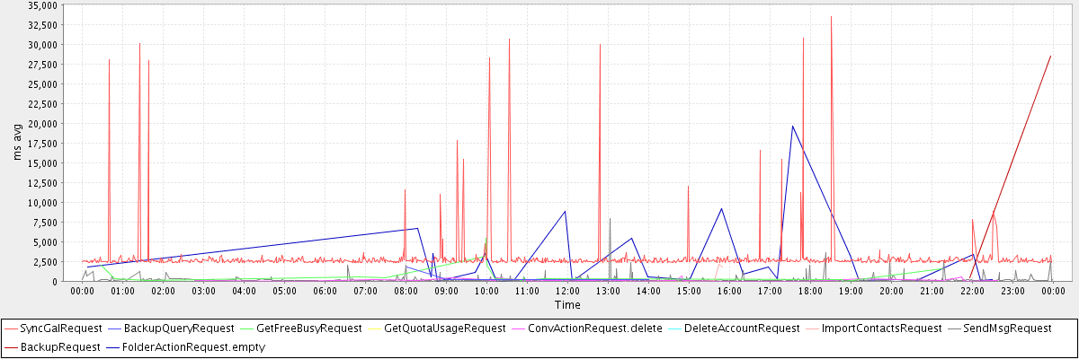 avg(SyncGalRequest) = 2981.44 avg(BackupQueryRequest) = 586.75 avg(GetFreeBusyRequest) = 712.08 avg(GetQuotaUsageRequest) = 3450.00 avg(ConvActionRequest.delete) = 136.53 avg(DeleteAccountRequest) = 1647.00 avg(ImportContactsRequest) = 311.23 avg(SendMsgRequest) = 199.75 avg(BackupRequest) = 14458.00 avg(FolderActionRequest.empty) = 2596.00