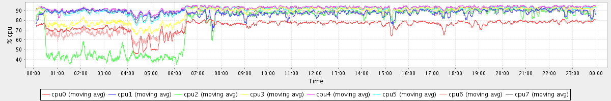 avg(cpu0) = 74.49 avg(cpu1) = 87.62 avg(cpu2) = 76.44 avg(cpu3) = 87.36 avg(cpu4) = 92.39 avg(cpu5) = 90.44 avg(cpu6) = 82.59 avg(cpu7) = 91.31