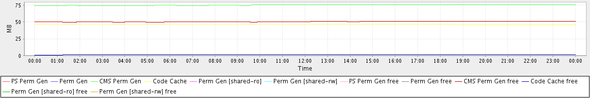 avg(PS Perm Gen) = 0.00 avg(Perm Gen) = 0.00 avg(CMS Perm Gen) = 75.39 avg(Code Cache) = 46.29 avg(Perm Gen [shared-ro]) = 0.00 avg(Perm Gen [shared-rw]) = 0.00 avg(PS Perm Gen free) = 0.00 avg(Perm Gen free) = 0.00 avg(CMS Perm Gen free) = 50.44 avg(Code Cache free) = 1.27 avg(Perm Gen [shared-ro] free) = 0.00 avg(Perm Gen [shared-rw] free) = 0.00