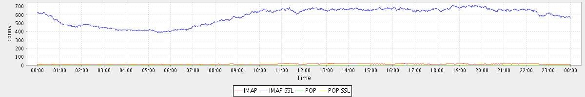 avg(IMAP) = 10.78 avg(IMAP SSL) = 583.18 avg(POP) = 0.67 avg(POP SSL) = 10.12