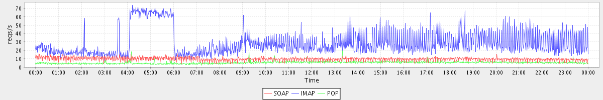 Host zm08.stanford.edu: Mailboxd: Request Rate by Client Protocol