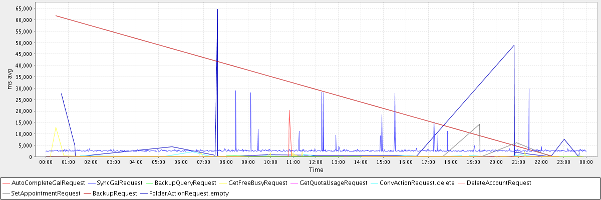 avg(AutoCompleteGalRequest) = 343.58 avg(SyncGalRequest) = 2837.83 avg(BackupQueryRequest) = 257.00 avg(GetFreeBusyRequest) = 317.52 avg(GetQuotaUsageRequest) = 3507.00 avg(ConvActionRequest.delete) = 234.37 avg(DeleteAccountRequest) = 1628.00 avg(SetAppointmentRequest) = 302.64 avg(BackupRequest) = 31129.50 avg(FolderActionRequest.empty) = 8684.79