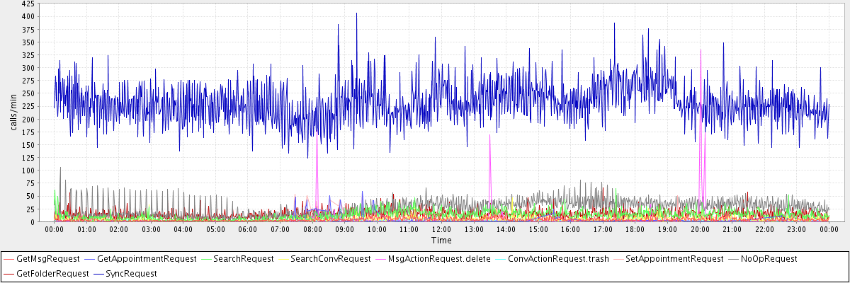 max(GetMsgRequest) = 31.00 max(GetAppointmentRequest) = 59.00 max(SearchRequest) = 65.00 max(SearchConvRequest) = 46.00 max(MsgActionRequest.delete) = 334.00 max(ConvActionRequest.trash) = 32.00 max(SetAppointmentRequest) = 55.00 max(NoOpRequest) = 106.00 max(GetFolderRequest) = 66.00 max(SyncRequest) = 406.00